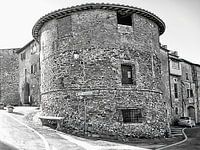 Een zwart-wit foto van een hoek van de stadsmuren van Panicale in Umbrië, Italië.