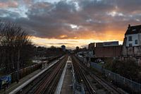 Het metrostation Pannenhuis / Tour en Taxis vanop de brug met spectaculaire wolken en een gouden hemel