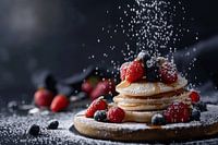Dit levendige beeld toont perfect bereide pannenkoeken versierd met een royale portie verse bessen en een scheutje stroop. Het gedetailleerde poedersuikereffect en de realistische kleuren maken het een uitstekend decoratiestuk voor keukens en eetkamers. Een must-have voor fijnproevers en liefhebbers van stijlvolle keukendecoratie.