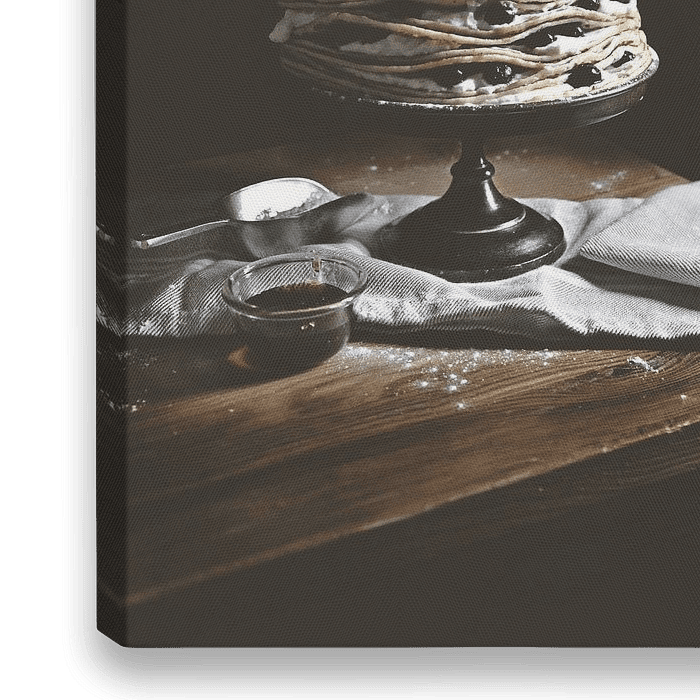 Pannenkoeken gefotografeerd in low-key bij natuurlijk licht. Door gebruik van oude materialen ontstaat een exclusieve afbeelding met vintage uitstraling. Prachtig in de keuken!