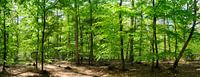 Een panoramafoto van een Beukenbos in het voorjaar. De zon schijnt op het mooie lichtgroene bladerdak met de verse blaadjes.