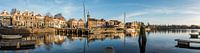 Panorama van de oude haven met monumentale huizen en oude boten van Blokzijl in de provincie Overijssel.