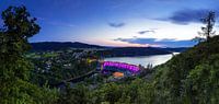 Panorama Edersee stuwdam en dorp met paars verlichte stuwmuur bij blauw uur van Frank Herrmann
