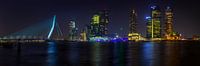 Panorama foto van de skyline van de Kop Van Zuid Rotterdam, met op de voorgrond de Nieuwe Maas en op de achtergrond de fraaie Erasmusbrug en onder andere de Cruise Terminal Rotterdam aan de Holland Amerikakade en het oude gebouw van de Holland Amerika Lijn.