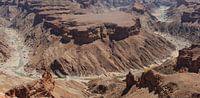 Panoramafoto van de Fish River Canyon met een meanderende rivier in de diepte. Berglandschap en uitzichtpunt in Namibië, Afrika. Na de Grand Canyon (VS) is dit de grootste kloof ter wereld. Miljoenen jaren oud, prehistorie.