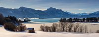 Een panorama beeld van de Forggensee in de winter.
