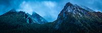 De Hochkalter is een van de hoogste bergen van Duitsland en torent hoog boven de regio Berchtesgadener Land uit. Het panorama toont de bergtoppen gezien vanaf de Hintersee op een avond in de herfst.
