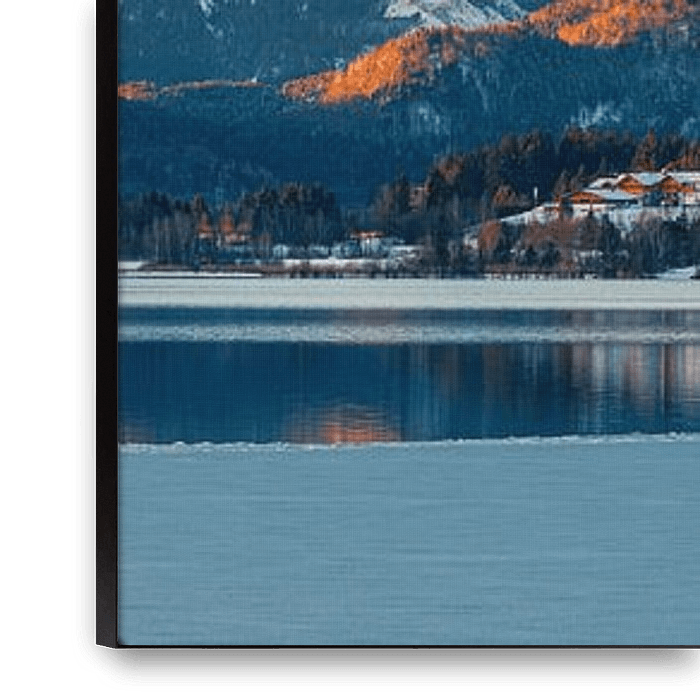 Een groot panoramabeeld in de winter met zonsopkomst over de Hopfensee, bij Hopfen am See met de het Karwendelgebergte in de achtergrond, gelegen nabij Füssen, in de Allgäu, in Beieren, zuid Duitsland.