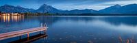 Loopbrug met uitzicht op de Hopfensee en de Allgäuer Alpen bij schemering