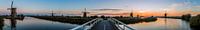 Panorama van Kinderdijk tijdens zonsopgang met elf molens in Alblasserwaard, Zuid-Holland.