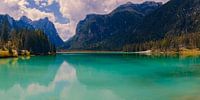 Een 2:1 panorama foto van het met meer van Dobbiaco, in het Italiaans Lago di Dobbiaco, maar in het Duits Toblachersee genoemd, is een mooi turquoise bergmeer in de Dolomieten en gelegen in Val Pusteria in de provincie zuid-Tirol in het noorden van Italië.