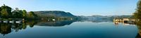Panorama Lake District, Engeland. Dit is het uitzicht over het meer Ullswater vanaf Pooley Bridge. Een mooi landschap met heuvels en bergen die weerspiegelen in het meer. Het Lake District is een populaire locatie bij landschapsfotografen vanwege de fotogenieke landschappen.