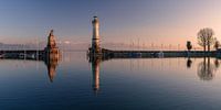 De idyllische vuurtoren in de haven van Lindau aan het Bodenmeer bij zonsondergang.