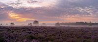 Panoramafoto van de Loonse en Drunense Duinen bij een mistige zonsopkomst met de heide in bloei.