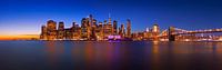 Panorama New York skyline met Brooklyn Bridge in de Verenigde Staten, Noord-Amerika. Een panorama van Manhattan gemaakt tijdens de schemering net na zonsondergang. De skyline van New York is één van de beroemdste stadsgezichten ter wereld met het Empire State Building, gebouw van de Verenigde Naties en One World Trade Center, WTC.