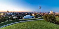 Panoramafoto van het Olympisch Stadion en de Olympische Toren in het Olympisch Park in München 's avonds op het blauwe uur. Rechts de BMW wolkenkrabber, ook bekend als de BMW Viercilinder of BMW Tower, het hoofdkantoor van BMW. Helemaal rechts op de achtergrond de rood verlichte Allianz Arena, het voetbalstadion van FC Bayern München, Beieren, Duitsland.