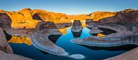 Zonsondergang bij Reflection Canyon in Lake Powell in Glen Canyon National Recreation Area, op de grens tussen Arizona en Utah, Verenigde Staten.