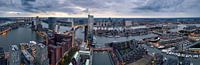 Een prachtig uitzicht over de stad Rotterdam net na zonsondergang. De kop van Zuid, de Erasmusbrug, de Hef alles is aanwezig in deze panorama.