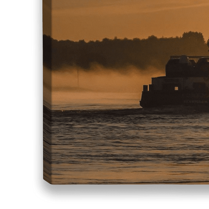 Koop dit landschapskunstwerk Panorama Schip op de Waal met zon (zonsopkomst) van John Verbruggen op canvas, aluminium dibond, (ingelijste) fotoprint, behang en ArtFrame, op maat geprint in Fine-Art kwaliteit.