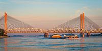Een vrachtschip op de Waal bij Zaltbommel op een zondagmorgen. Op de achtergrond de Dr. W. Hupkesbrug en de Martinus Nijhoffbrug.