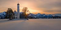 Een 2:1 panorama foto van een zonsondergang in de winter bij de St Coloman kerk, nabij Schwangau, met de Duitse Alpen in de achtergrond. Schwangau is gelegen nabij Füssen, in de Allgäu, in de staat Beieren, in zuid Duitsland.