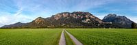 Panoramisch uitzicht op de Tegelberg in de Allgäu, een populaire berg voor paragliders. Op de rechterflank van de Tegelberg troont de burcht Neuschwanstein.