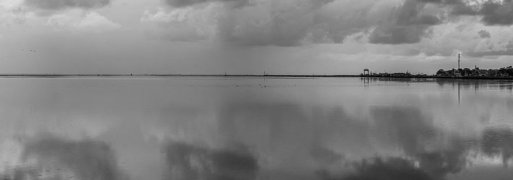 Een panorama van West-Terschelling samen met de haven en een prachtige, in het water weerspiegelende, wolken partij. Met op de achtergrond de Brandaris. Gemaakt in zwart / wit om het een beetje dramatischer te maken.