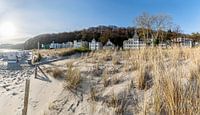 Panoramafoto met strandstoelen op het strand in Binz op het eiland Rügen, branding, Oostzeekust, strandboulevard