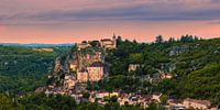 Een 2:1 panorama beeld van een avond tijdens zonsondergang bij Rocamadour, een stad en bedevaartsoord in Frankrijk.
