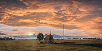 Een 2:1 panorama beeld van een zonsondergang met oplichtende wolken bij het monument "Onze Lieve Vrouw van de Bloeiende Betuwe’" in Bemmel (gemeente Lingewaard), een uit bakstenen opgetrokken Mariakapel.