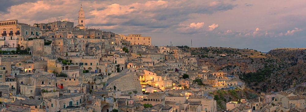 Terwijl het daglicht verdwijnt, licht de oude stad Sassi di Matera op. De stenen huizen en smalle steegjes schitteren zachtjes tegen de avondhemel.