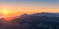 Een 2:1 panorama beeld van een zonsopkomst gezien vanaf Mirador del Fitu, Asturië, Spanje. Het is een van die weinige plekken die een spectaculair 360 graden uitzicht biedt in het landschap van Asturië.