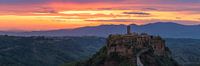 Een 3:1 panorama foto van een zonsopkomst bij Civita di Bagnoregio, een afgelegen dorp in de gemeente Bagnoregio in de provincie Viterbo, Lazio, in Midden-Italië.