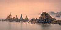 Een 2:1 panorama foto van een mistige zonsopkomst op het strand van Gueirua, een kleine baai met kiezels die vooral opvalt door het prachtige landschap.