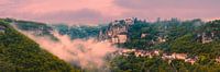 Een weids 3:1 panorama beeld van een vroege ochtend met lage bewolking en mist tijdens zonsopkomst bij Rocamadour, een stad en bedevaartsoord in Frankrijk.