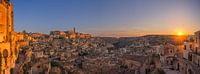 Een 65x24 Xpan-panorama foto en de eerste zonnestralen kruipen langzaam boven de horizon uit en werpen een warme, goudoranje gloed over de oude stad Matera.