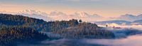 Een weids 3:1 panorama beeld van een mistige zomerochtend tijdens zonsopkomst in het Emmental, een dal in centraal Zwitserland, in het kanton Bern, met uitzicht op de sneeuwtoppen van de Zwitserse Alpen in het Berner Oberland.