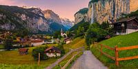 Een 2:1 panorama beeld van een zonsopkomst in Lauterbrunnen, een gemeente in het district Interlaken-Oberhasli in het Zwitserse kanton Bern.