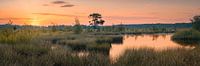 Een weids 3:1 panorama beeld van een zonsopkomst boven een ven in het Nationaal Park Dwingelderveld, het grootste natte heidegebied van West-Europa. Gelegen in de Nederlandse provincie Drenthe, in de driehoek Dwingeloo, Ruinen en Beilen.
