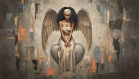 Een engel met prachtige zwarte krullende haren zit op een zilveren hart. De achtergrond bestaat uit abstracte vakken die met paletmes zijn aangebracht. Sfeervol, warm en spiritueel kunstwerk. De warme grijs tinten passen in bijna elk interieur. Gemaakt op basis van een houtskool tekening en gegenereerd met hulp van AI techniek.
