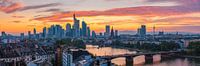 Zonsondergang boven Frankfurts Mainhattan, het centrale zakelijke district van Frankfurt am Main in Duitsland. Het woord is een portmanteau van Main, de rivier waarop Frankfurt ligt, en Manhattan, een verwijzing naar de visueel indrukwekkende hoogbouw en wolkenkrabbers van de binnenstad.