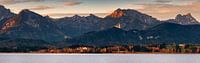 Een panorama foto van een zonsopkomst met herfstkleuren bij de Hopfensee, gelegen bij de plaats bij Hopfen am See, met de Allgäur Alpen in de achtergrond.
