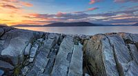 Een panorama foto van de zonsondergang boven Sogne Fjord in Noorwegen met rotsen op de voorgrond en een mooie kleurrijke wolkenlucht op de achtergrond.