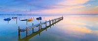 Een panorama foto van de zonsondergang boven het IJsselmeer. Een stijger staat in het water en de boten drijven stil op het wateroppervlak. Het is een mooie windstille avond met prachtige kleuren in de lucht.
