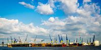 Panorama haven Hamburg met kranen en droogdokken aan de rivier de Elbe met bewolkte hemel