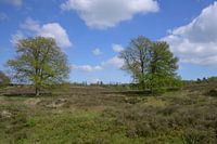 De heide bij de gemeente Heelsum in Gelderland is een prachtig stukje Nederland. Dit fotogenieke landschap wordt gekenmerkt door de afwisseling van heide en bossen en smalle zandpaadjes. Een blauwe lucht waarin mooie witte wolken hangen, vormen een fraaie achtergrond en maakt dit werk een stilleven. Het werk is gemaakt op een mooie Mei dag in 2021.