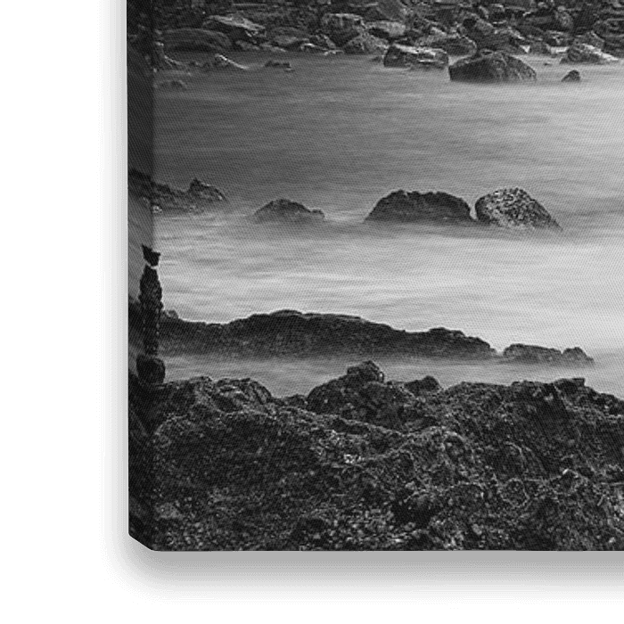 Een weids 3:1 panorama beeld in Zwart-wit van een vroege ochtend bij Playa de Portizuelo, een natuurlijk erfgoed gelegen in de gemeente Valdés, binnen de Vaqueira regio van westelijk Asturië, nabij de stad Luarca, Spanje.
