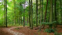 Een foto van paadje dat in een ronding een bos met beuken in gaat. De foto heb ik genomen in het bos in Emmen; de Emmerdennen. Het hele bos is mooi belicht met weinig hoog contrast. Het bospad neemt je mee het bos in.