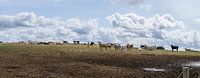 Panorama met een kudde koeien in een geel graslandschap en wolken in de lucht in Cornwall England UK