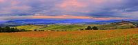 Het is voorjaar in Toscane en velden vol met klaprozen kleuren het landschap rood en groen zoals we hier zien op een vroege ochtend bij Agriturismo Poggio Covili, gelegen in Val d'Orcia in het Toscaanse landschap in midden-Italië.